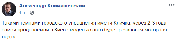 "Такими темпами городского управления имени Кличка, через 2-3 года самой продаваемой в Киеве моделью авто будет резиновая моторная лодка", – пишет в Facebook медийщик Александр Климашевский.
