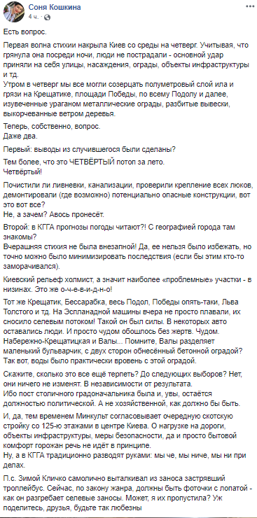 Журналистка Соня Кошкина напоминает, что это уже четвертый потоп в Киеве за лето.