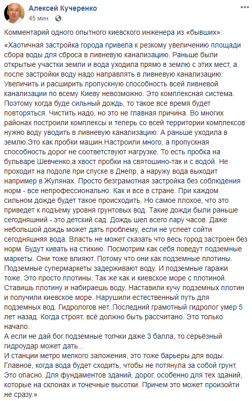Кучеренко приводит слова инженера, который описывает причины захлестнувших Киев наводнений.