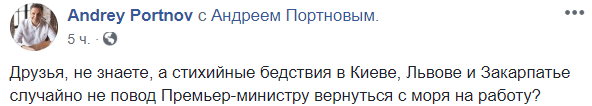 "Друзья, не знаете, а стихийные бедствия в Киеве, Львове и Закарпатье случайно не повод премьер-министру вернуться с моря на работу?" – пишет адвокат Андрей Портнов.