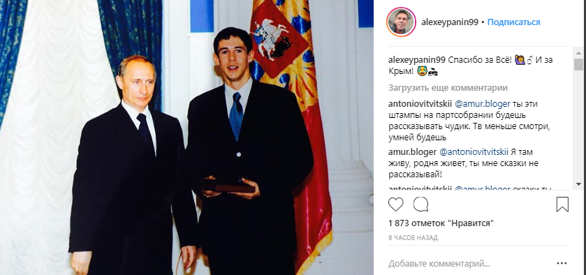 К слову, здесь же есть фотография Алексей Панина с Путиным. Под снимком подпись: Спасибо за все! И за Крым!".