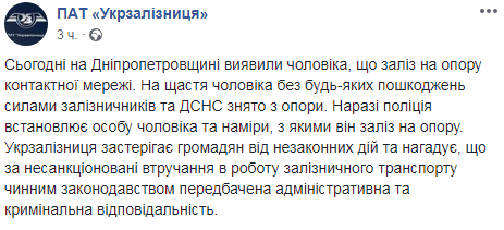 "Сегодня на Днепропетровщине обнаружили мужчину, который залез на опору контактной сети. К счастью мужчину без каких-либо повреждений силами железнодорожников и ГСЧС сняли с опоры. Сейчас полиция устанавливает личность мужчины и намерения, с которыми он залез на опору", - сообщила пресс-служба "УЗ".