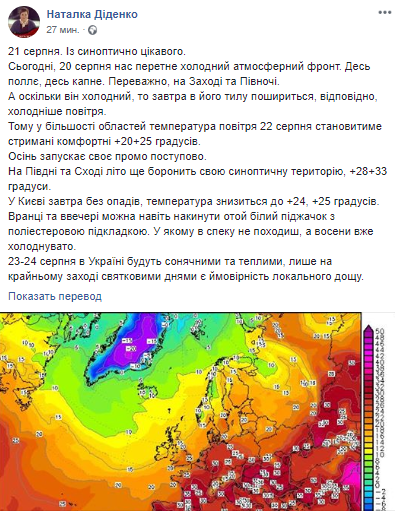 Завтра, 22 августа, в большинстве областей Украины температура воздуха снизится до +20-25 градусов. Такой прогноз на своей странице в соцсети опубликовала синоптик Наталья Диденко.