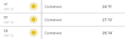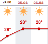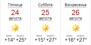 Сайт Weather.com сообщает о трех солнечных днях с 24 по 26 августа включительно. На День независимости днем до +24, на выходных - до +29...+30.