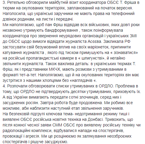 Вместе с тем, она официально проинформировала представителей РФ и ОБСЕ о том, что 22 россиянина, осужденных в Украине за подготовки терактов, диверсии, шпионаж, участие в незаконных вооруженных формированиях и военных действиях, написали обращение к президенту России Владимиру Путину с просьбой переместить их на территорию РФ в обмен на украинцев, удерживаемых в российских тюрьмах.