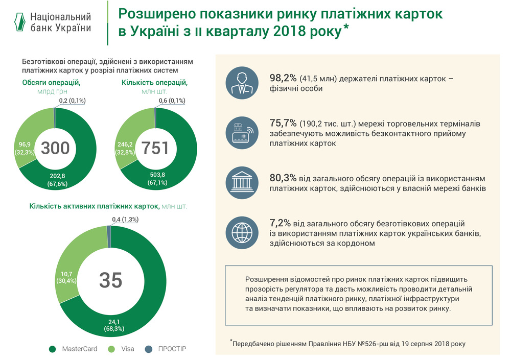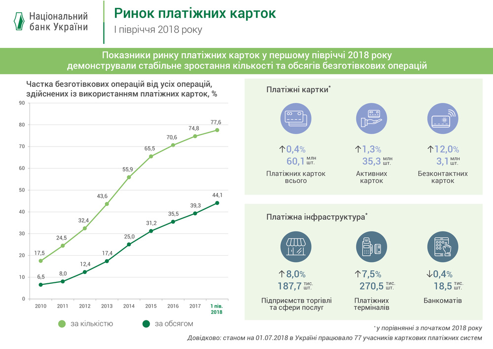 Всего же, по подсчетам Нацбанка, количество активных карт за первые полгода 2018-го выросло на 1,3% до 35,3 млн. штук. Объем безналичных операций, осуществленных с их помощью, составил 573 млрд. грн.