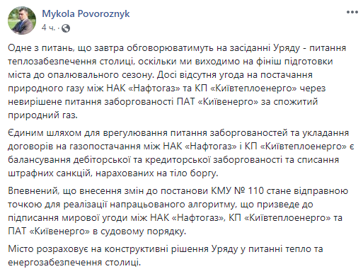 Киев рассчитывает на конструктивные решения правительства в вопросе тепло- и энергообеспечения украинской столицы.  Об этом написал на своей странице в Facebook первый заместитель председателя КГГА Николай Поворозник.