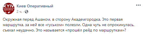 "Окружная перед Ашаном, в сторону Академгородка. Это первая маршрутка, за ней все "гуськом" полезли. Одна чуть не опрокинулась, съехал неудачно. Это называется "прошёл рейд по маршруткам"?" -говорится в сообщении.