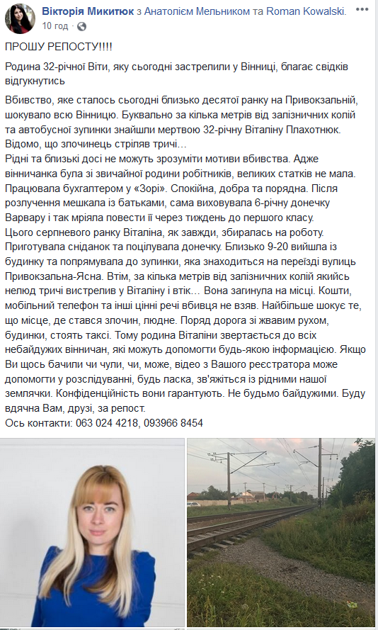 Больше всего шокирует то, что место, где произошло преступление, людное. Ряядом дорога с оживленным движением, дома, стоянка такси. Поэтому семья Виталины обращается ко всем неравнодушным винничанам, которые могут помочь любой информацией. Если вы что-то видели или слышали, или видео с регистратора есть - все это может помочь в расследовании, пожалуйста, свяжитесь с родными нашей землячки. Конфиденциальность они гарантируют. Вот контакты: 063 024 42 18, 093 966 84 54", - написала Виктория Никитюк.