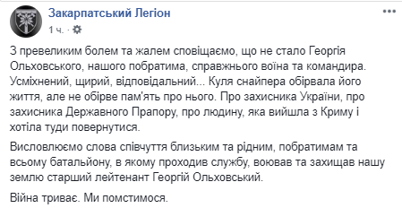 "С превеликой болью и сожалением сообщаем, что не стало Георгия Ольховского, нашего собрата, настоящего воина и командира. Пуля снайпера оборвала его жизнь, но не оборвет память о нем. Об защитнике Украины, о защитнике Государственного Флага, о человеке, который вышел из Крыма и хотел туда вернуться", - говорится в сообщении.