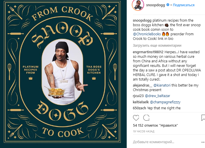 "Платиновые рецепты от босса кухни Догга. Первая кулинарная книга Snoop Dogg скоро пойдет в печать к издательства Chronicle Books", - написал рэпер.