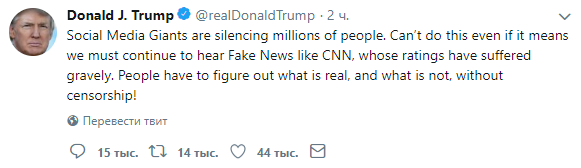 "Медиа-гиганты заставляют молчать миллионы людей. Это недопустимо даже при том условии, что при этом нам придется терпеть производителей "фейковых новостей", таких как Си-Эн-Эн, чьи рейтинги значительно пострадали. Людям нужно научиться определять, без цензуры, что правда, а что нет", - написал он на своей странице в Twitter.