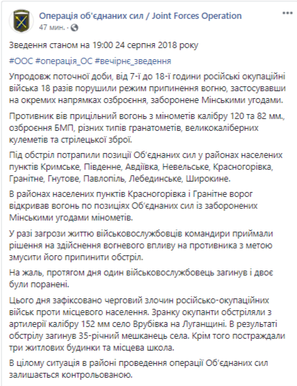 В течение дня пятницы, с 7.00 до 18.00, боевики 18 раз нарушили режим прекращения огня на Донбассе, применив на отдельных направлениях вооружение, запрещенное минскими соглашениями, погиб один военнослужащий, еще двое ранены, сообщает пресс-центр штаба Операции объединенных сил (ООС) в Facebook.