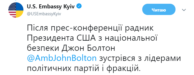 В День независимости Украины Советник Президента США по национальной безопасности Джон Болтон и посол США в Украине Мари Йованович встретились с лидерами политических партий и фракций Украины. Фото: twitter.com/USEmbassyKyiv