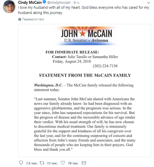 Супруга американского сенатора от Республиканской партии Джона Маккейна Синди прокомментировала его решение о прекращении лечения опухоли мозга, диагностированной в июле 2017 года. Она поблагодарив всех за помощь на своей странице в Twitter.