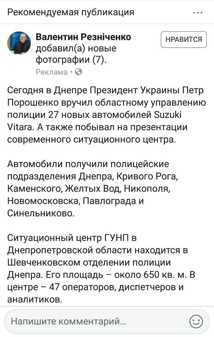 В социальной сети Facebook пост председателя Днепропетровской ОГА Валентина Резниченко о том, как Президент Украины Петр Порошенко вручил областному управлению полиции 27 новых автомобилей, продвигается как реклама.