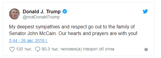 "Мои глубочайшие соболезнования и уважение семье сенатор Джона Маккейна. Наши сердца и молитвы с вами!" – написал глава Белого дома в Twitter.