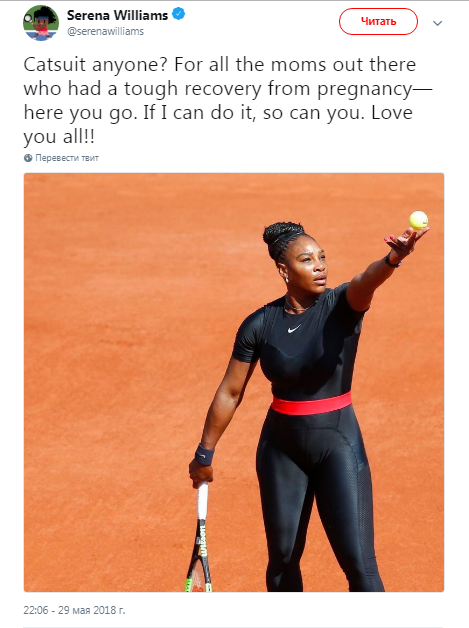 Серена Уильямс, которая в декабре 2017 года объявила о возвращении в профессиональный спорт после родов, выступала на последнем Открытом чемпионате Франции в обтягивающем черном костюме с красным поясом. Ее костюм вызвал критику со стороны президента Федерации тенниса Франции Бернара Джудичелли.