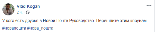 "У кого есть друзья в Новой Почте Руководство. Перешлите этим клоунам", - написал он. В комментариях пользователи соцсети высказали разные версии о причинах произошедшего.