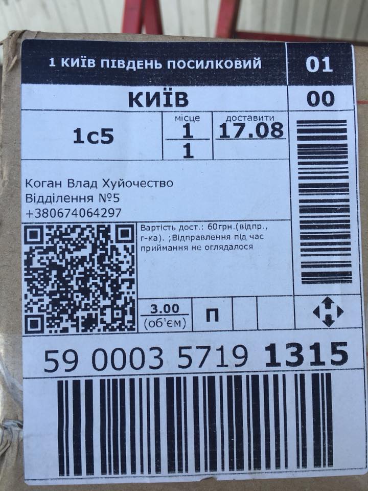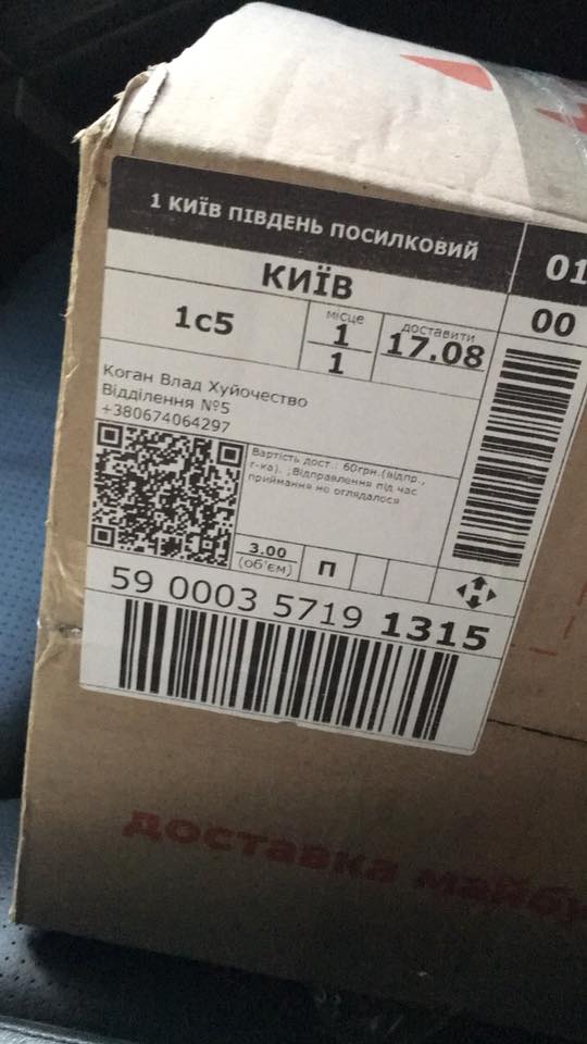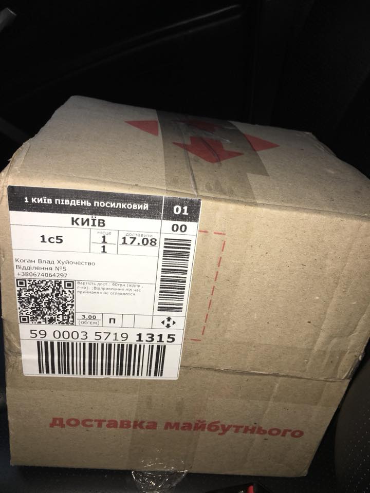 Об этом сам Влад Коган рассказал в Facebook. Посылка с данными получателя на имя "Коган Влад Ху*отчество" была отправлена из Кривого Рога.