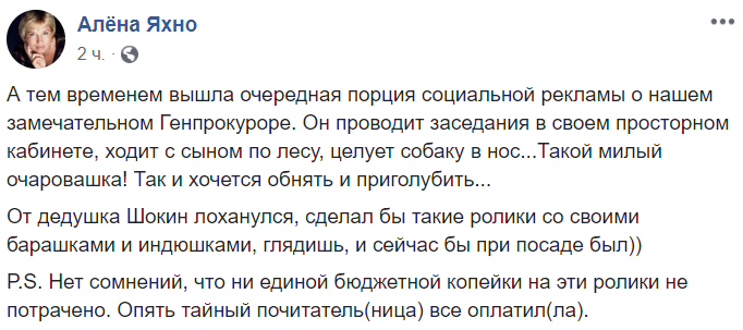"А тем временем вышла очередная порция социальной рекламы о нашем замечательном генпрокуроре. Он проводит заседания в своем просторном кабинете, ходит с сыном по лесу, целует собаку в нос...Такой милый очаровашка! Так и хочется обнять и приголубить...