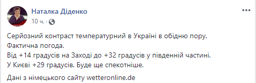 От +14 градусов на Западе до +32 градусов в южной части. В Киеве 29 градусов", -написала она.