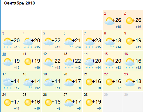 При этом сайт Accuweather считает, что практически весь сентябрь продержится температура от +19 до +25. Самая холодная часть месяца выпадет на период с 23 по 25 сентября: от +14 до +16. Преимущественно сентябрь будет сухой, хотя временами обещают дождь.