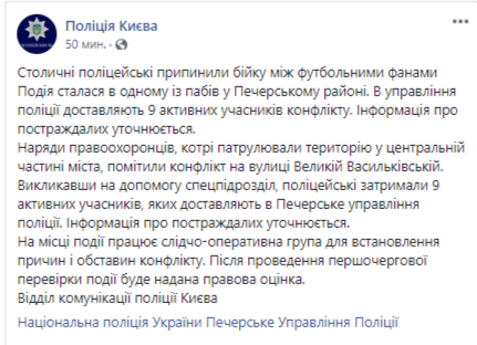 В свою очередь отдел коммуникации полиции г.Киев сообщает, что инцидент произошел в одном из пабов в Печерском районе. "Наряды полиции, которые патрулировали территорию в центральной части города, заметили конфликт на ул.Большой Васильковской. Вызвав на помощь спецподразделение, полицейские задержали 9 активных участников, которых доставляют в Печерское управление полиции", - сказано в сообщении.