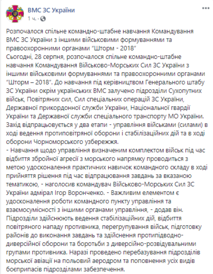 "Учения по управлению определенным комплектом войск во время отражения вооруженной агрессии с морского направления проводятся с целью усовершенствования практических навыков командного состава", - заявил командующий ВМС ВСУ Игорь Воронченко.