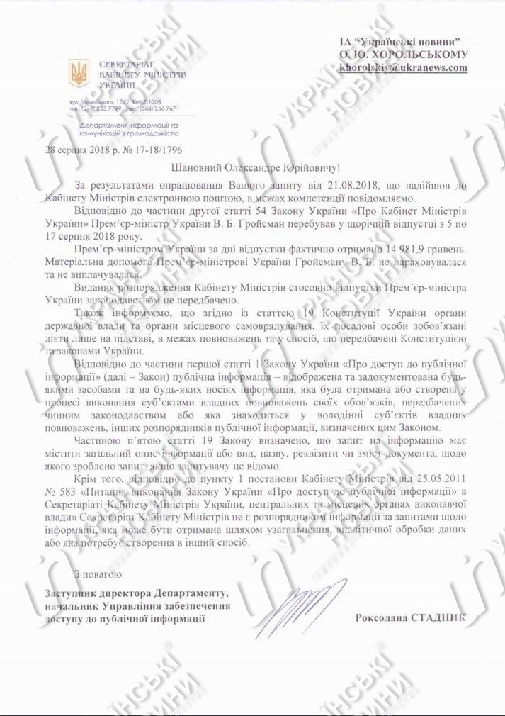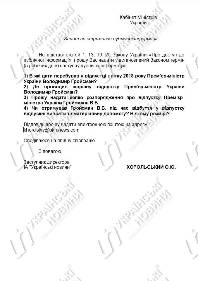 21 августа журналисты направили запрос в Секретариат Кабмина с просьбой предоставить следующие сведения: "В какие даты находился в отпуске летом 2018 года премьер-министр Украины Владимир Гройсман?