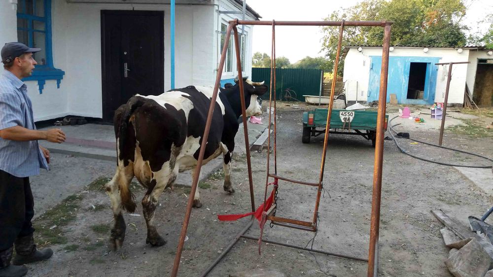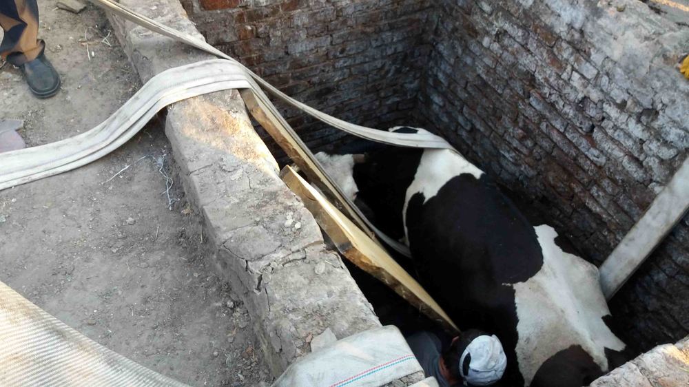 Спасатели прибыли по адресу Белоцерковский район, село Храпачи, улица Веселая. Корова упала в силосную яму глубиной 2,5 метра. При помощи напорных рукавов пожарные подняли животное на землю