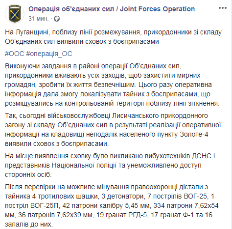 "Правоохранители извлекли из тайника 4 тротиловых шашки, 3 детонатора, 7 выстрелов ВОГ-25, 1 выстрел ВОГ-25П, 42 патрона калибра 5,45 мм, 334 патрона 7,62х54 мм, 36 патронов 7,62х39 мм, 19 гранат РГД-5, 17 гранат Ф-1 и 16 запалов к ним. Все найденные взрывные предметы и боеприпасы… изъяты представителями Национальной полиции", - говорится в опубликованном сообщении.