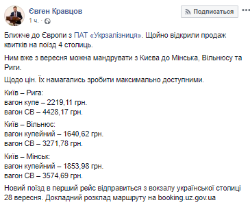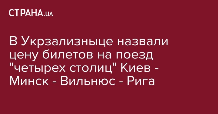 ПАО "Укрзализныця" открыла продажу билетов на поезд "четырех столиц", которым можно путешествовать из Киева в Минск, Вильнюс и Ригу. Об этом на своей странице в Facebook написал и.о. главы правления компании Евгений Кравцов, который заявил, что цены пытались сделать максимально доступными.