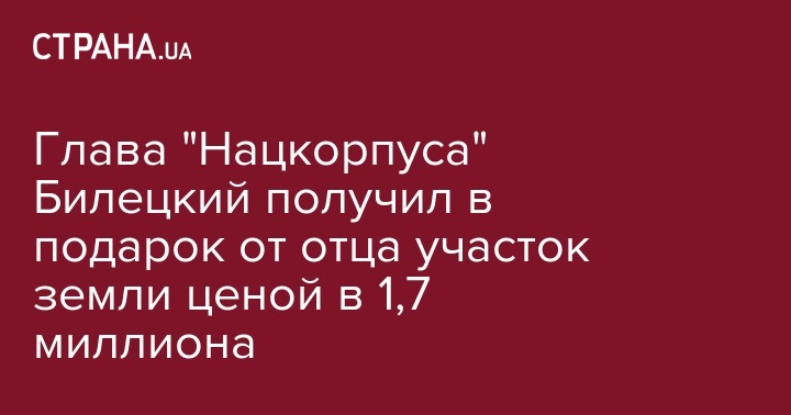 Председатель партии "Национальный корпус", основатель полка "Азов" Андрей Билецкий получил от отца в подарок земельный участок стоимостью почти 1,7 миллиона гривен. Об этом стало известно из измененной декларации Билецкого на сайте Единого реестра.