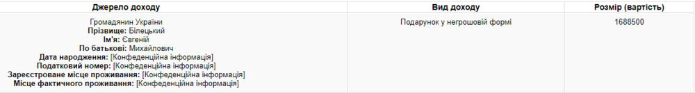 Кроме этого, 300 тысяч гривен Билецкий держит в банке.