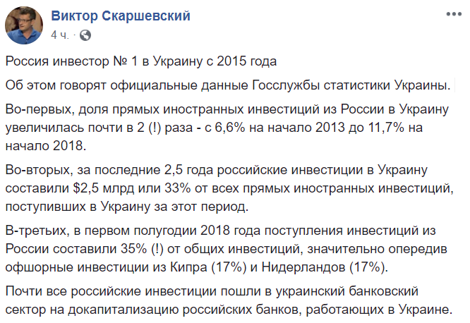 "Во-первых, доля прямых иностранных инвестиций из России в Украину увеличилась почти в 2 (!) раза - с 6,6% на начало 2013 года до 11,7% на начало 2018 года.