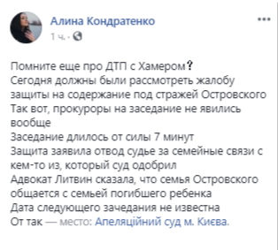 "Сегодня должны были рассмотреть жалобу защиты на содержание под стражей Островского. Так вот, прокуроры на заседание не явились вообще. Заседание длилось от силы 7 минут. Защита заявила отвод судье за семейные связи с кем-то из, который суд одобрил. Адвокат Литвин сказала, что семья Островского общается с семьей погибшего ребенка. Дата следующего заседания неизвестна", - уточнила она.