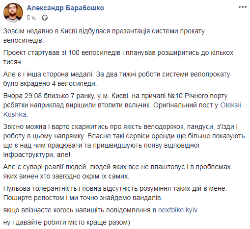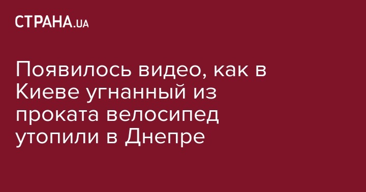 В Киеве группа молодежи утопила в реке Днепр велосипед, который взяли напрокат в nextbike.kyiv. Инцидент произошел около 7 утра в среду, 29 августа. Запись произошедшего велась камерой наблюдения. Видео опубликовал в Facebook блогер Александр Барабошко.