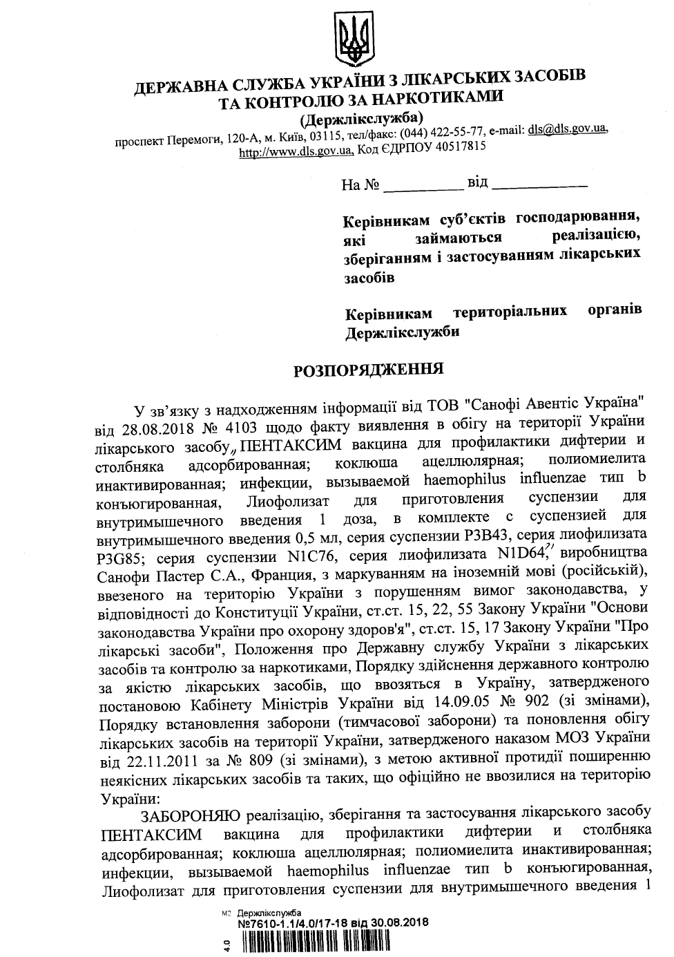 "Запретить реализацию, хранение и применение лекарственного средства Пентаксим, вакцина для профилактики дифтерии и столбняка, коклюша и полиомиелита 0,5 мл, различных серий, французского производства, из-за нарушения требований украинского законодательства", - сказано в документе.
