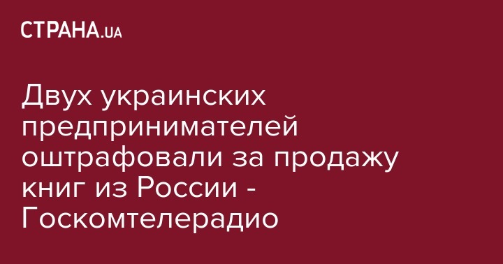 Государственный комитет Украины по вопросам телевидения и радиовещания (Госкомтелерадио) информирует, что двое предпринимателей оштрафованы за распространение без соответствующего разрешения российской издательской продукции в Харькове и Киеве.