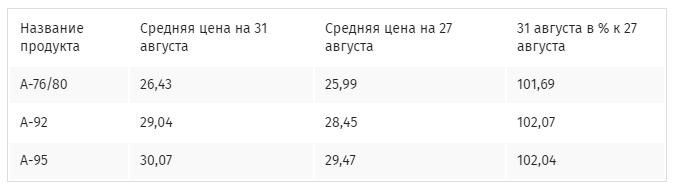 Розничные цены на бензин 27-31 августа, гривен/литр: