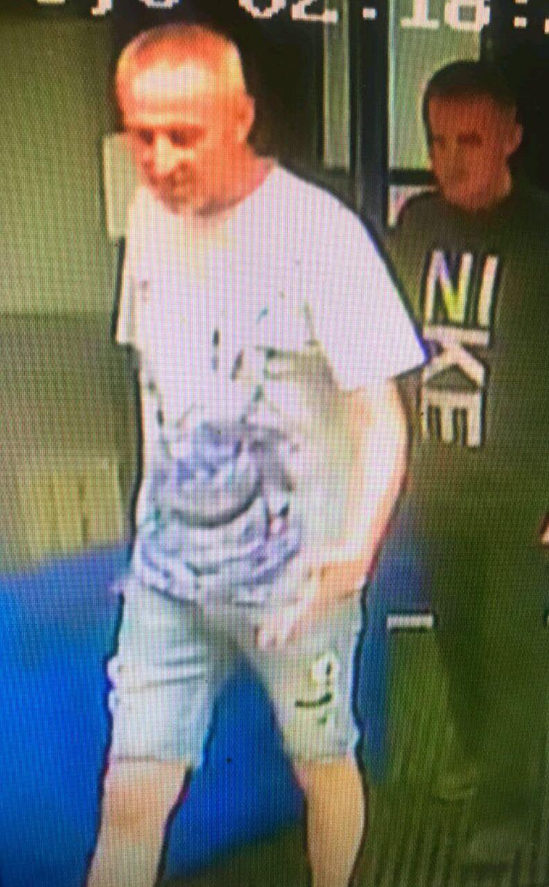Подозреваемый №2: рост 175-180 см, возраст 40-48 лет, среднего телосложения, лицо овальное, губы средние, нос длинный, прямой, заостренный, волосы с проседью, короткие, большая лобная залысина. Был одет: в белую футболку с рисунком, джинсовые шорты светло-синего цвета.