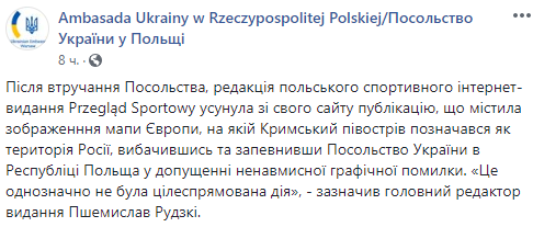 Польское спортивное издание Przeglad Sportowy после вмешательства посольства Украины  устранило со своего сайта публикацию, которая содержала изображение карты Европы, на которой Крымский полуостров обозначался как территория России.