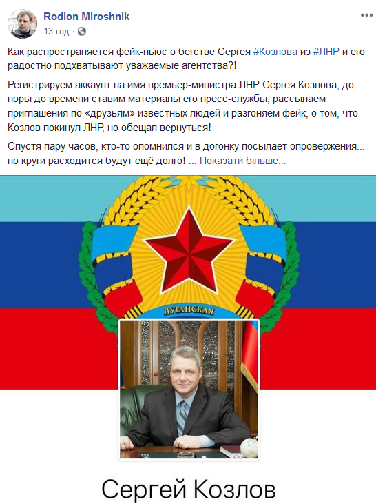 "Как распространяется фейк-ньюс о бегстве Сергея Козлова из "ЛНР" и его радостно подхватывают уважаемые агентства?