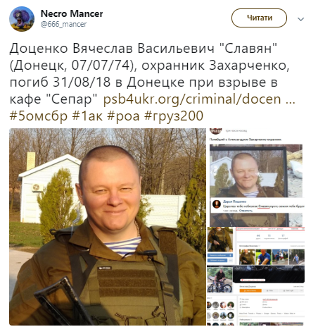 В соцсети опубликовано фото личного охранника лидера так называемой "ДНР" Александра Захарченко - 44-летнего Вячеслава Доценко (позывной "Славян"), который погиб вместе со свим шефом 31 августа во время взрыва в кафе "Сепар" в центре Донецка.