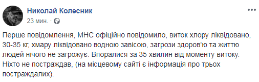 "Утечка хлора ликвидирована, 30-35 кг, облако ликвидировано водной завесой, здоровью и жизни людей ничего не угрожает. Справились за 35 минут с момента утечки. Никто не пострадал, (на местном сайте есть информация о трех пострадавших)", - написал депутат криворожского горсовета Николай Колесник.