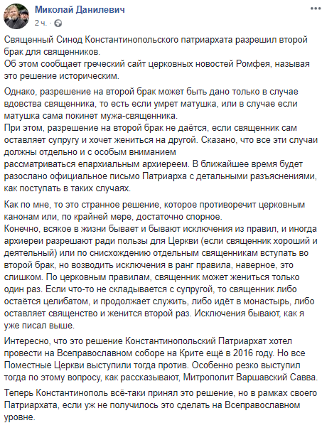 "Конечно, всякое в жизни бывает и бывают исключения из правил, и иногда архиереи разрешают ради пользы для Церкви (если священник хороший и деятельный) или по снисхождению отдельным священникам вступать во второй брак, но возводить исключения в ранг правила, наверное, это слишком. По церковным правилам, священник может жениться только один раз. Если что-то не складывается с супругой, то священник либо остаётся целибатом, и продолжает служить, либо идёт в монастырь, либо оставляет священство и женится второй раз", - пишет Николай Данилевич.