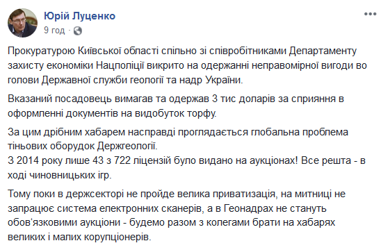"Прокуратурой Киевской области совместно с сотрудниками Департамента защиты экономики Нацполиции разоблачен на получении неправомерной выгоды и.о. председателя Государственной службы геологии и недр Украины.