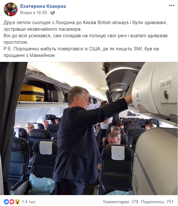 Фото Порошенко обнародовала Екатерина Козориз, ссылаясь на своих друзей. Она написала, что в салоне президент всем улыбался и удивил простотой. Снимок был сделан в самолете по пути президента из Лондона в Киев. В столице Великобритании он делал пересадку после полета в Вашингтон, где принял участие в прощании с Джоном Маккейном. При этом фотографии с трансатлантического перелета украинского президента в сети не появлялись.
