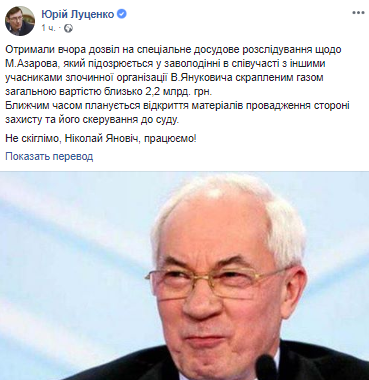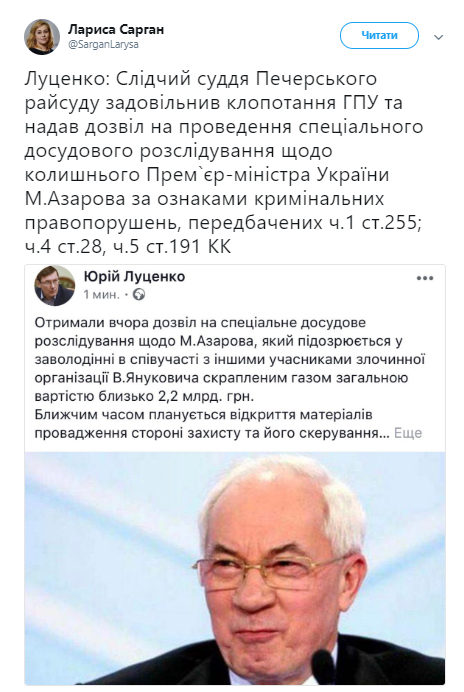 "Получили вчера разрешение на специальное досудебное расследование в отношении Азарова, который подозревается в завладении в соучастии с другими участниками преступной организации Януковича сжиженным газом общей стоимостью около 2200000000 грн", - говорится в посте генпрокурора.